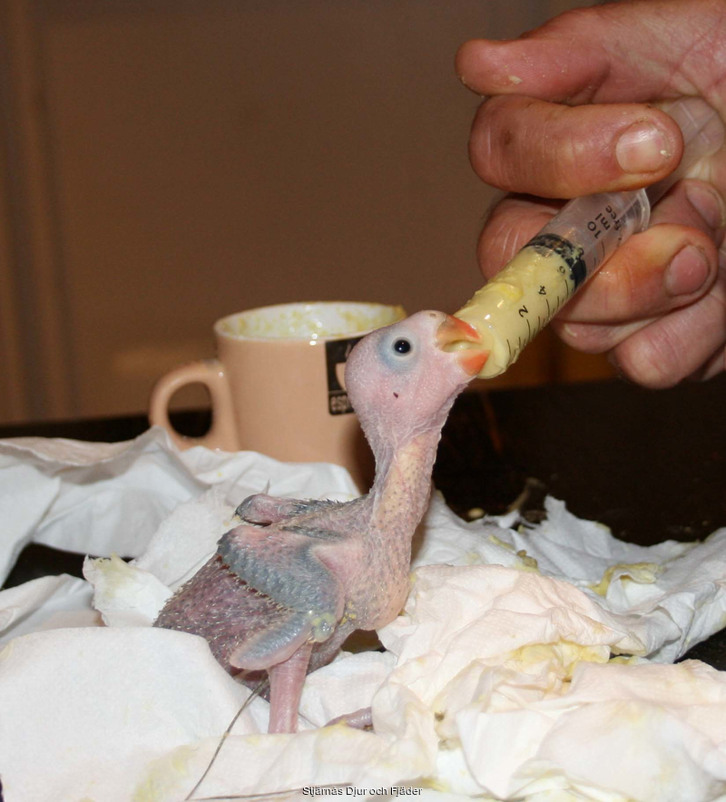 Men då kommer ofta frågan, är det svårt? Nja vi har fött upp en mängd fåglar med handuppmatning och det är inte svårt bara man håller hygien och värme samt känner till grundreglerna.