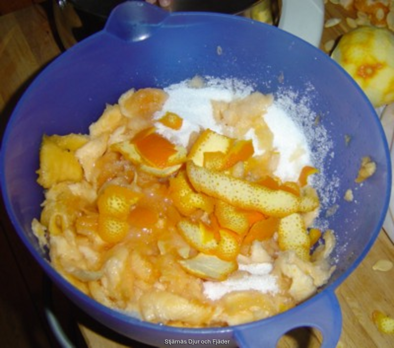 Lägg pumpa, apelsin och socker i en skål som får stå svalt i 24 timmar.